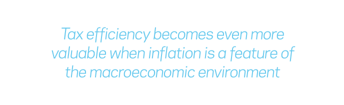 Even when inflation is at 0%, tax efficiency is a good idea (first trio of blue bars). But the insight here is that tax efficiency becomes even more valuable when inflation is a feature of the macroeconomic environment, as it has become