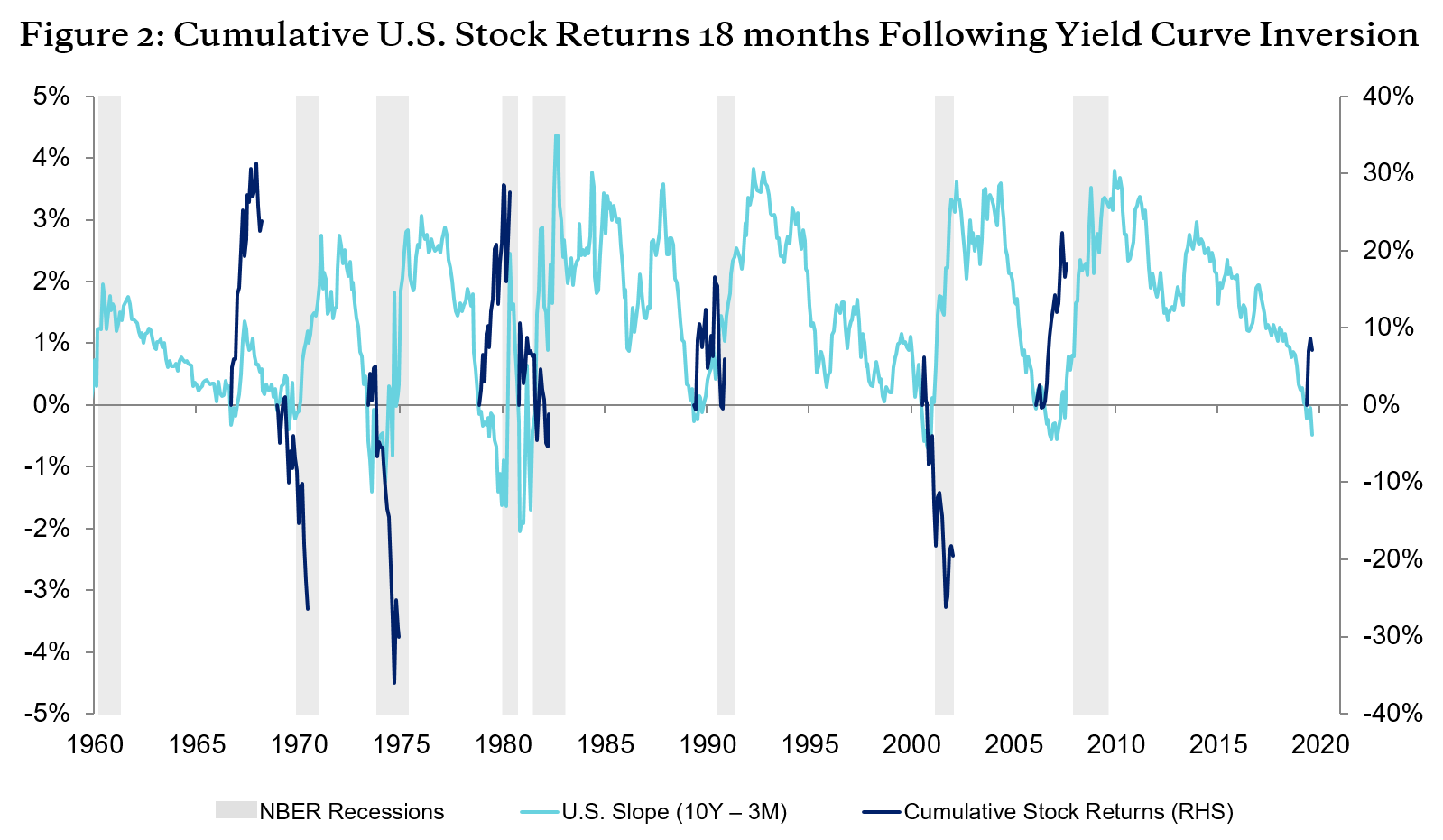 Does an inverted curve provide more useful market-timing guidance than the other indicators discussed above? Not necessarily. As Figure 2 below shows, curve inversions have reliably indicated that a recession will occur, but not with enough precision to time the top of a bull market. Inversions have been followed by strong equity performance on several occasions, including (as of this writing) the current episode. Yield curve inversions have also not been strong predictors of recession outside the United States, a finding that must reduce our confidence in the signal’s predictive power, even in the United States. Acting on yield curve inversions then is not advisable.